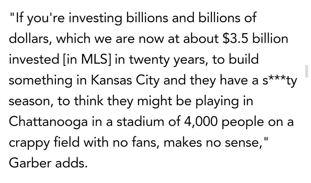 That said, I was the lone Chattanoogan in the crowd on Saturday morning when you called out my fair city in your argument against promotion and relegation, as though it were some hellish backwater where the likes of Kansas City might be forced to play if they were to suffer the indignity of being sent down. I almost choked on my breakfast pie. Let me set the record straight: